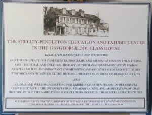 White Horse Inn (circa 1762) – The White Horse Inn is of Georgian Style and its principal façade constructed of dressed sandstone similar to the Douglass masonry. Built circa 1762, and later enlarged by George Douglass by the 30bays to the left in the photo, the building served as a tavern during Colonial times and through the Federal period into the 19th century. It was preceded from the late 1720s until the1760s by Marcus Huling’s “Public House” in his home on the river, just south of Mouns Jones House, now within the Amity Township sewer plant site. Hulings’ house became the “White Horse” by the mid-1750s. The surviving White Horse was purchased by the Trust I n 1970 and has undergone significant restoration since. Today, the building is fully restored, adding a 20th-century frame kitchen. The Historic Preservation Trust of Berks County houses its office on the second floor. The Inn is available for private gatherings and events.