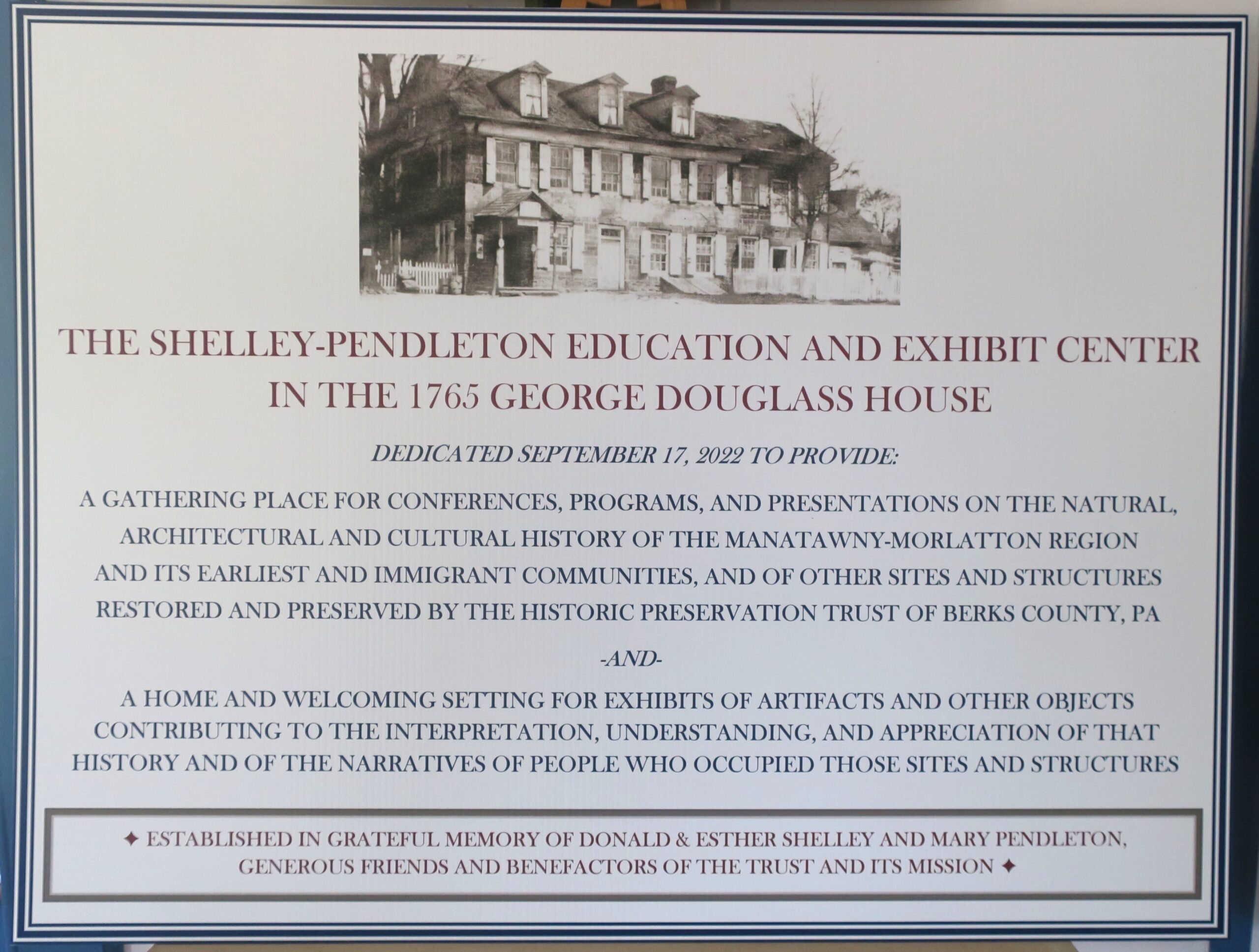 Since its Charter in 1964, the Trust has acquired numerous architecturally and historically significant sites and structures in eastern Berks County, currently having custody of and preservation responsibility for eight stone buildings from the early settlement years of the region, including the oldest documented building still standing in Berks County, the Mouns Jones House: