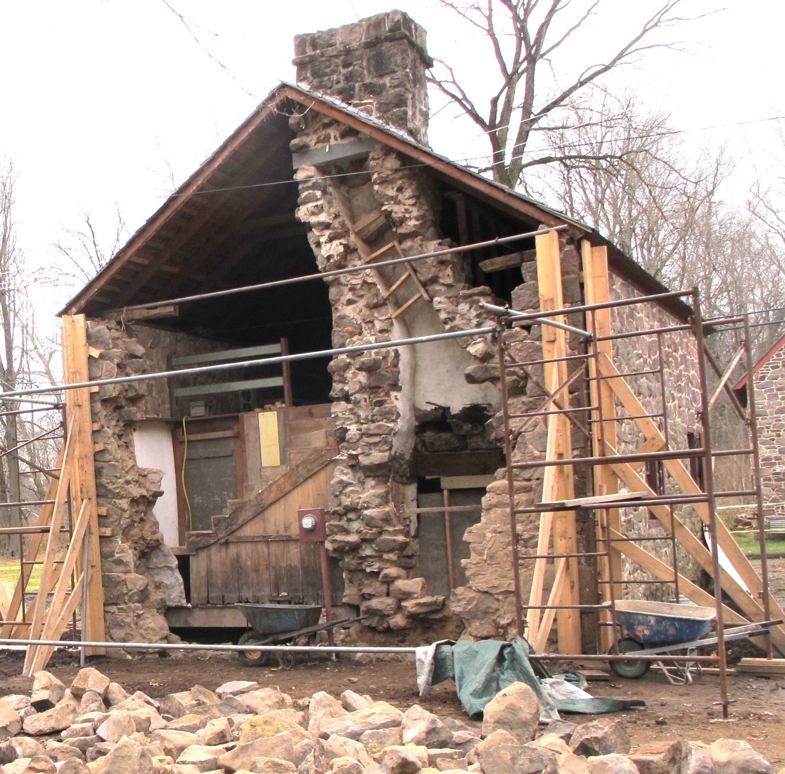 Restoration of walls, flooring, and roofing of the building took place in 1968-70, and reconstruction of the south gable wall in 2011-12. A temporary plywood first floor was replaced in 2024 with black locust harvested from and sawn on the site.