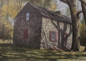 War veteran who became the Village handy-man and a journeyman carpenter. The house is a one-story and attic random-rubble sandstone structure originally built on a partitioned kitchen-stove room plan. A half-cellar, often flooded, is below the stove room. Many entries in late 18th century Amity Store ledgers reflect transactions with Michael Fulp (“Folb”, in his estate records): credits to him for “mowing the meadow”, “working boards”, and many other tasks; and debits for rum, wine, and other necessities.